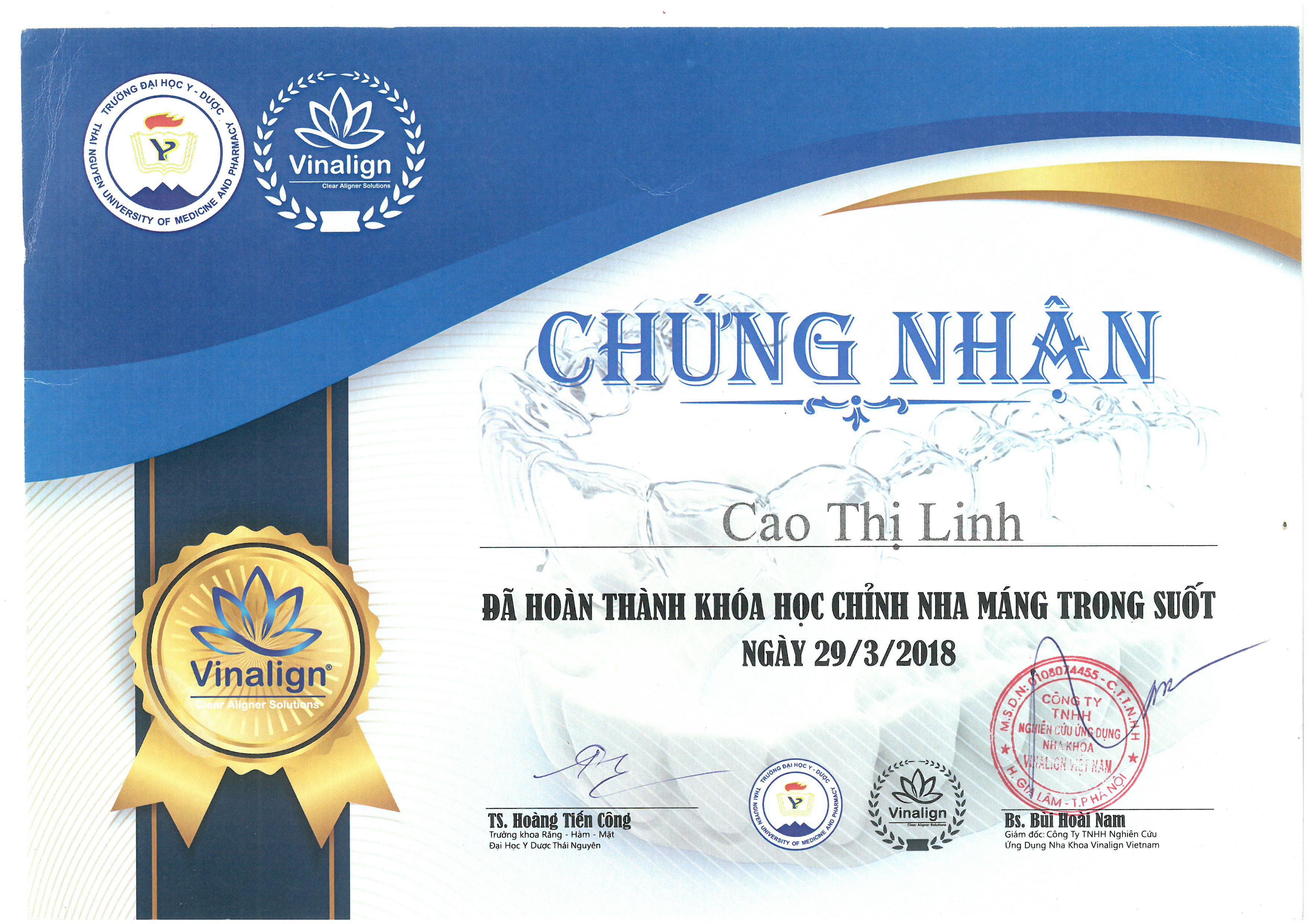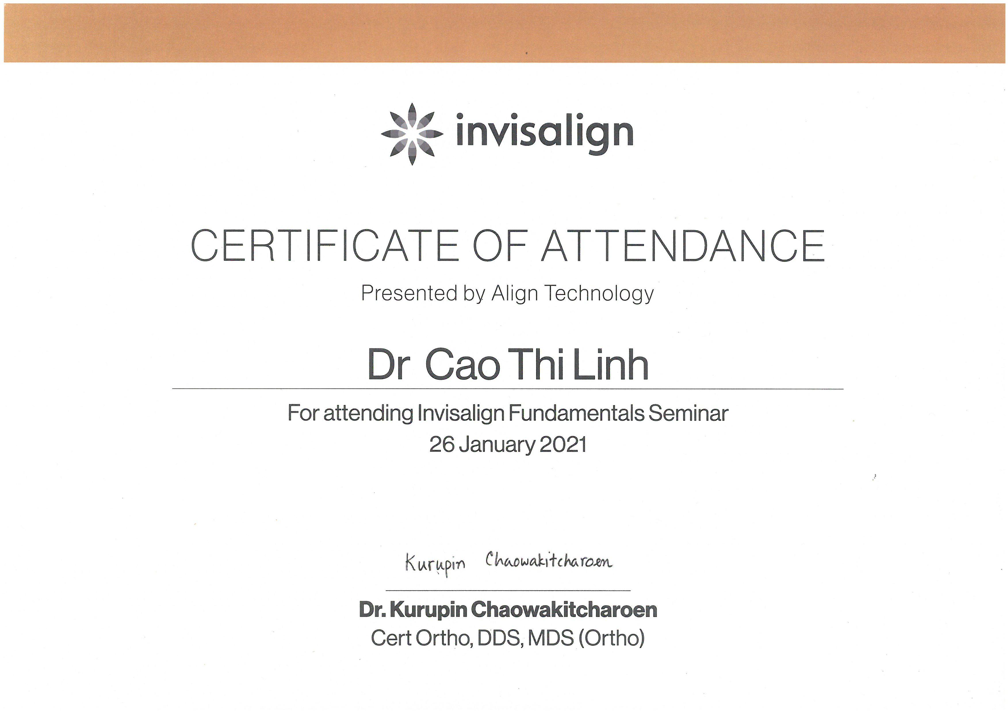 Không dừng lại ở đó, bác sĩ Cao Linh còn học và nhận được chứng chỉ niềng răng trong suốt Invisalign của Mỹ để thể thực hiện cả phương pháp niềng răng trong suốt. Bởi đây là phương pháp đòi hỏi công nghệ cao và bác sĩ phải được đào tạo bài bản chuyên sâu về Invisalign mới có thể thực hiện được.