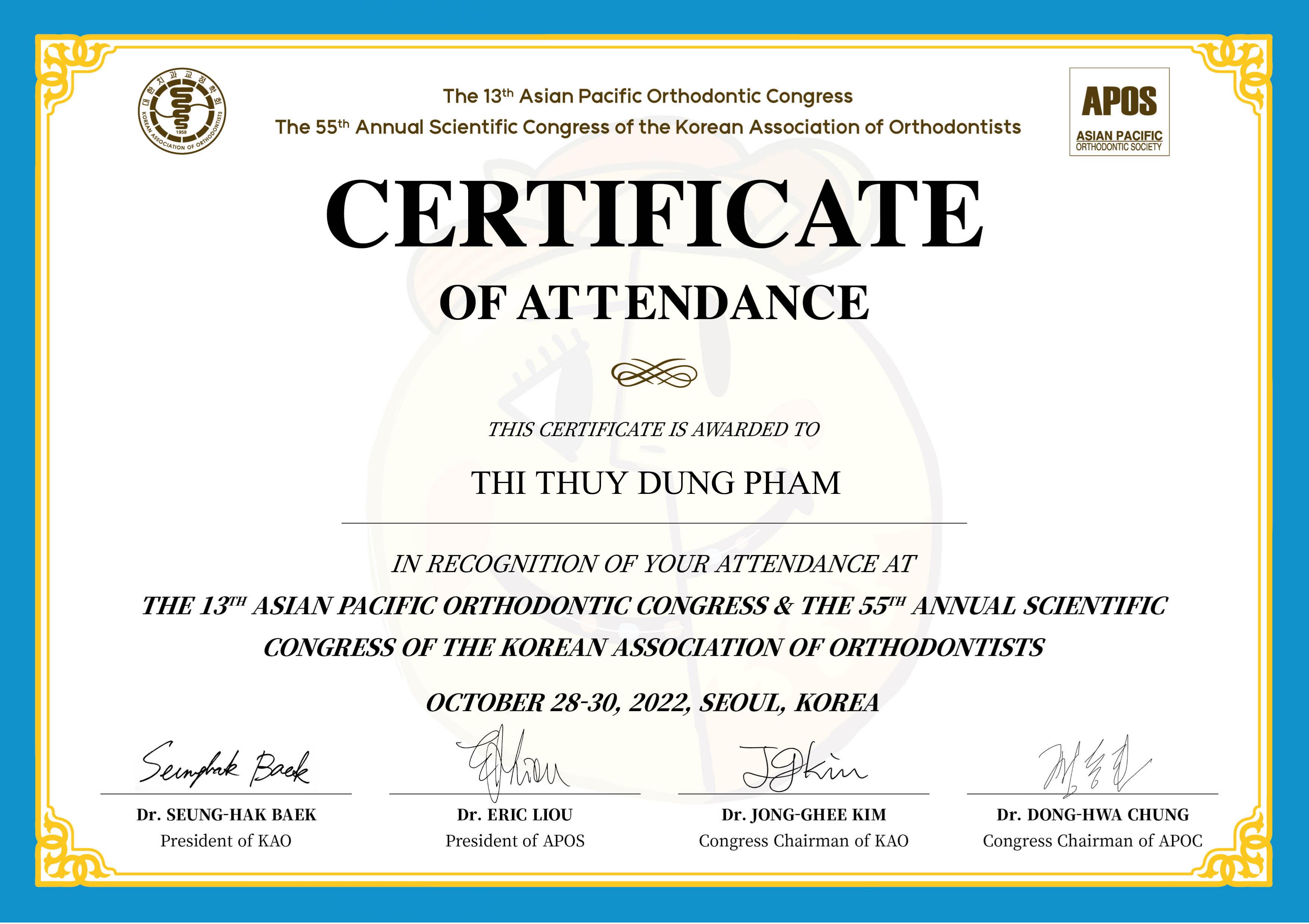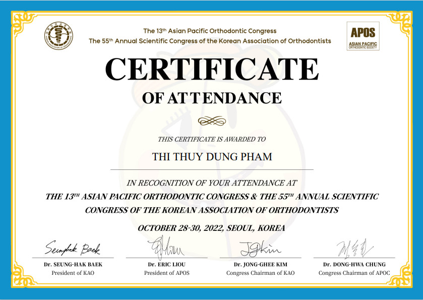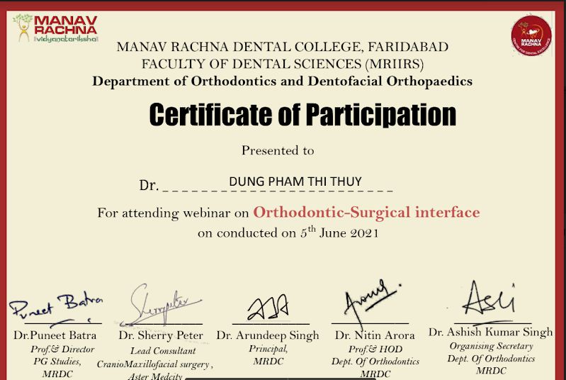 Không dừng lại ở đó, bác sĩ Dung còn tham gia khóa đào tạo chuyên sâu về nghiệp vụ niềng răng Invisalign tại Mỹ và hội thảo Kết hợp Chỉnh nha- Phẫu thuật của trường Đại học Manav Rachna, Ấn Độ để trau dồi và nâng cao kỹ năng của bản thân.
