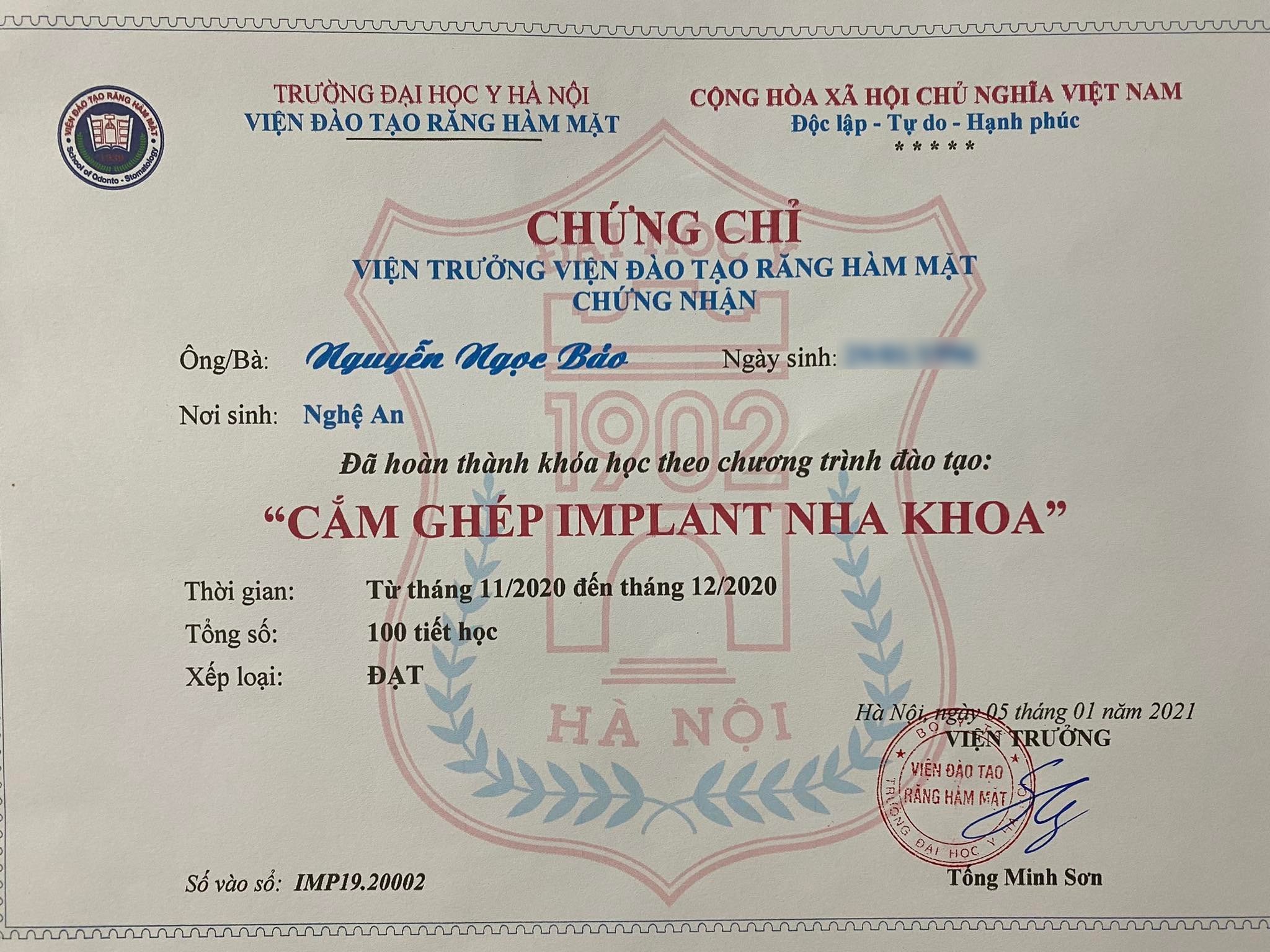 • Chứng chỉ cấy ghép Implant do Bộ Y tế cấp