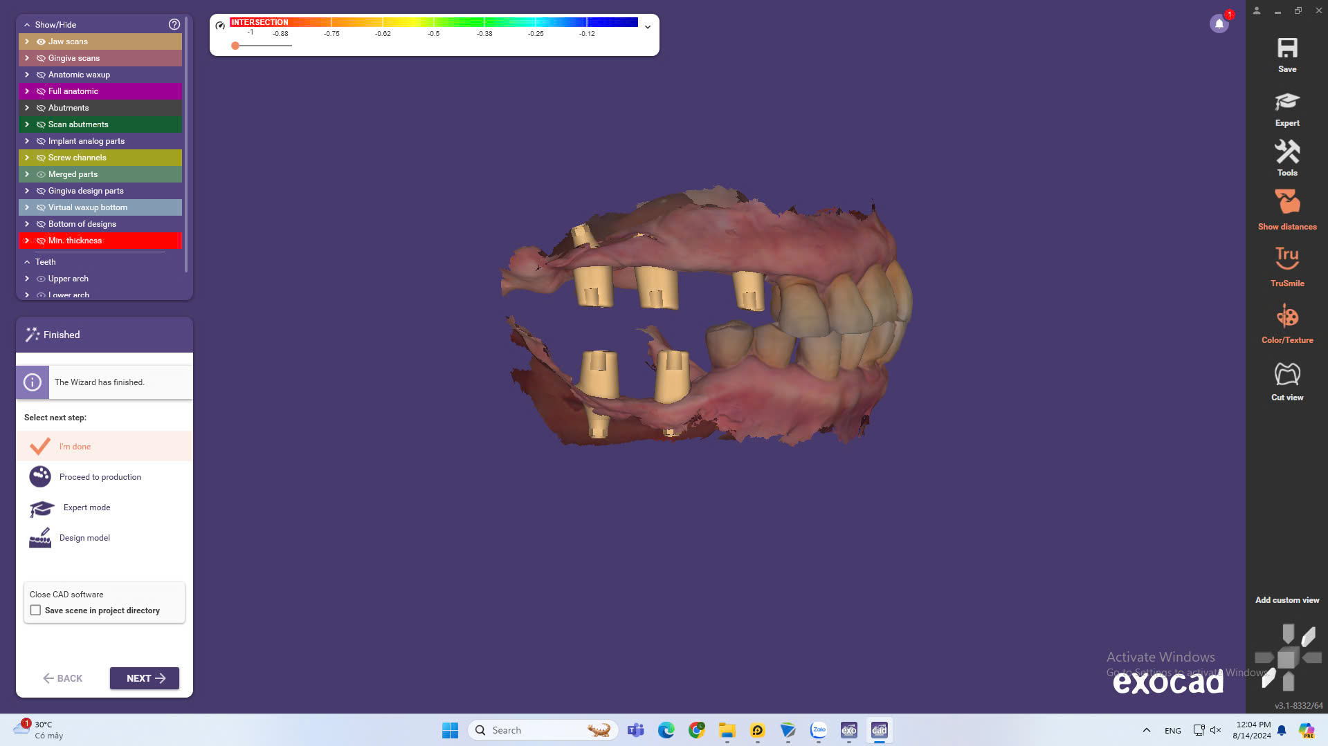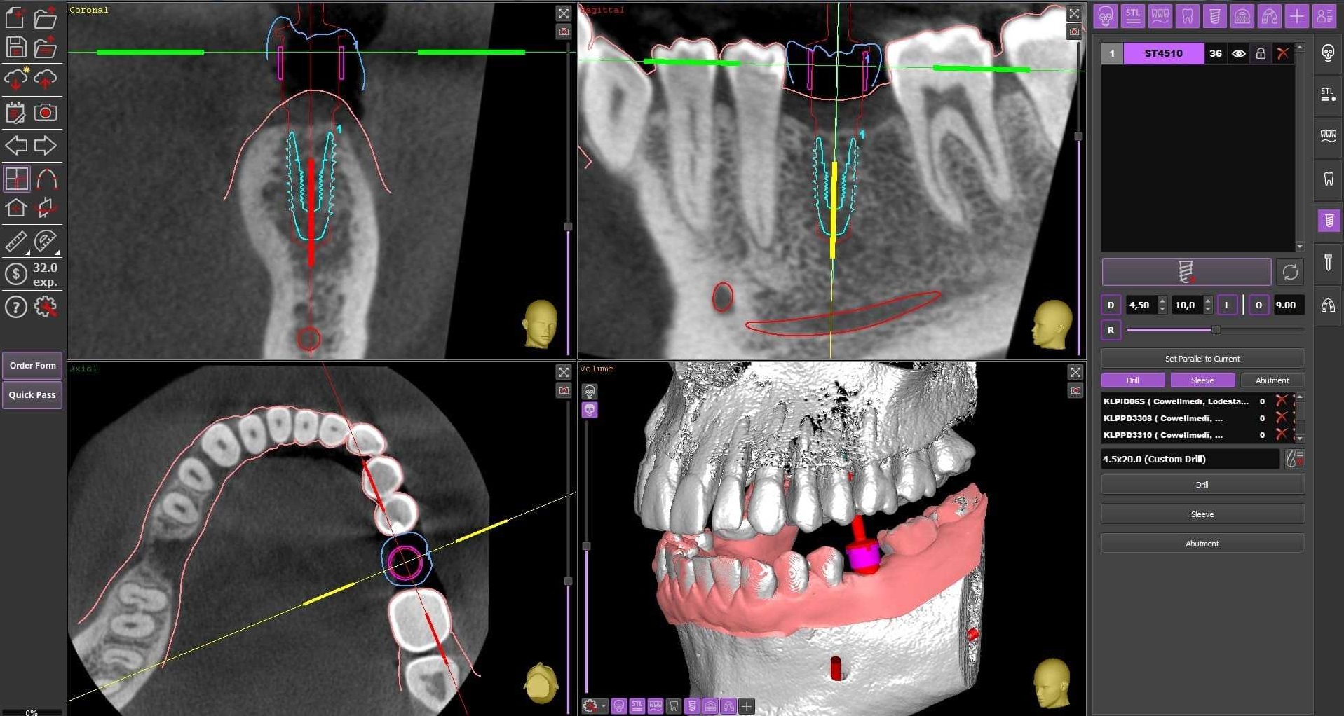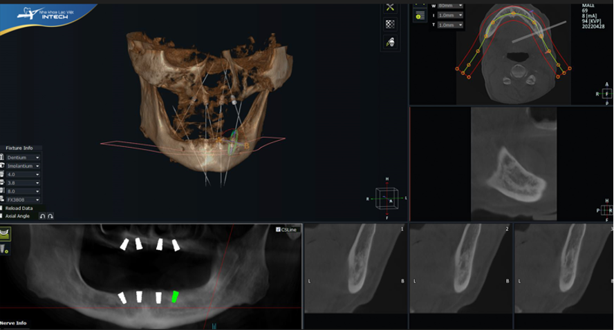 Đầu tiên, bệnh nhân sẽ tiến hành chụp phim CT Conebeam và Scanning răng, chụp ảnh trong và ngoài miệng. Từ các dữ liệu thu thập được sẽ đưa vào vào phần mềm Exocad để lập kế hoạch điều trị. Với khả năng phân tích về lực, Exocad cho phép bác sĩ tính toán chính xác vị trí cũng như hướng đặt implant.