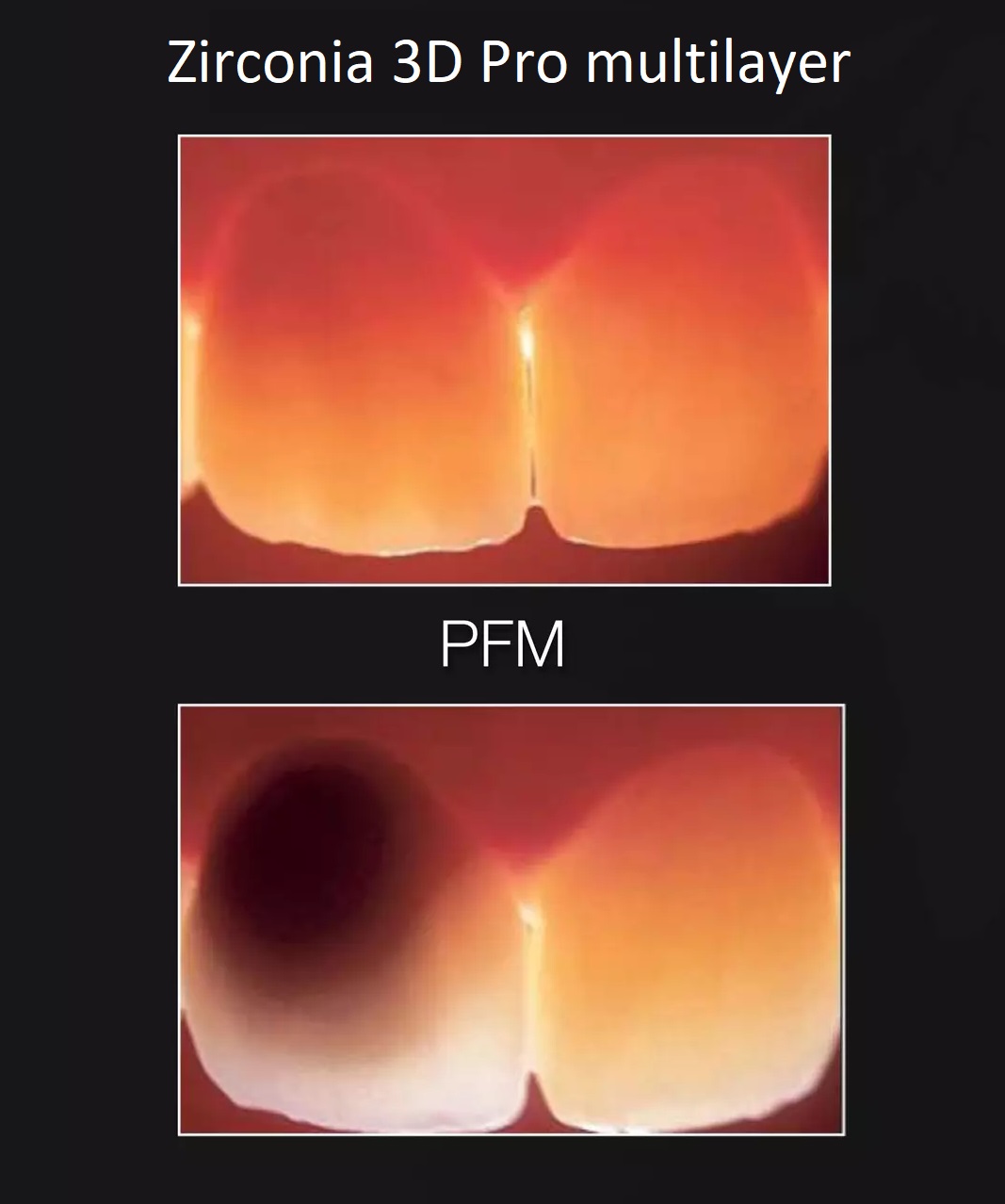 Răng sứ dòng Zirconia Multilayer có sự biến thiên cả về màu sắc, độ trong và độ cứng giống như răng thật.