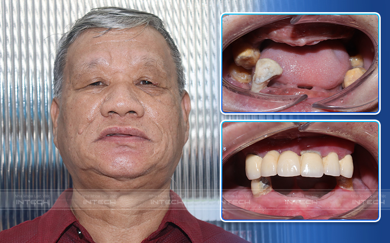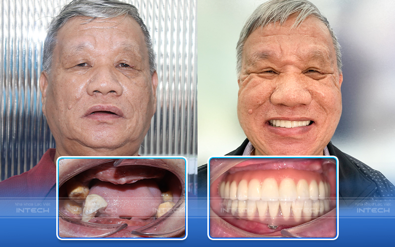 Sau khi tháo cầu răng sứ, nhổ bỏ những răng bị lung lay và cắm trụ thì chú không còn bị đau nhức, viêm nhiễm nữa. Quá trình cắm trụ cũng diễn ra thuận lợi, nhẹ nhàng và không đau. Khi các trụ implant tích hợp tốt vào xương hàm, chú Tuấn đã quay trở lại nha khoa Lạc Việt Intech để lắp răng sứ trên implant, hoàn thành quá trình điều trị. Hiện tại, chú Tuấn đã sở hữu 2 hàm răng mới chắc chắn, đảm bảo thẩm mỹ và chức năng ăn nhai.