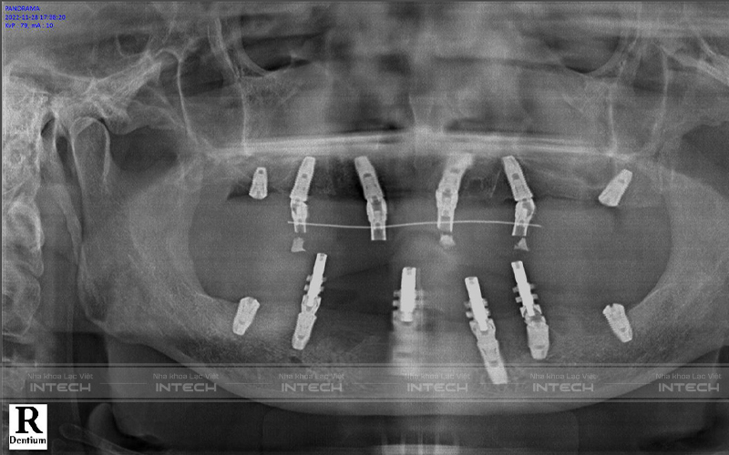 Dựa trên tình trạng lâm sàng, dữ liệu chụp phim, đội ngũ y bác sĩ tại Nha khoa Lạc Việt Intech đã ứng dụng công nghệ Safe-tech để đưa ra phương án điều trị là nhổ bỏ những răng bị lung lay, hư hỏng nặng và trồng implant 2 hàm bằng phương pháp All-on-6.