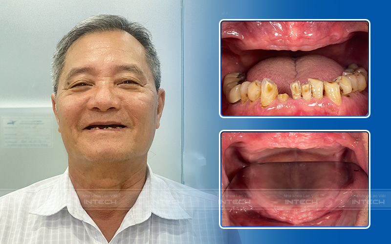 Đánh giá về tình trạng của chú Doãn Văn Chinh, bác sĩ Nguyễn Hoàng Dương – Chuyên gia cấy ghép implant tại Nha khoa Lạc Việt Intech chia sẻ: “Chú Chinh đến với chúng tôi trong tình trạng mất toàn bộ răng hàm trên và hiện đang sử dụng hàm giả tháo lắp. Hàm dưới của chú cũng có một vài răng bị tổn thương, tuy nhiên chúng tôi có thể bảo tồn được bằng các phương pháp cơ bản. Vấn đề chính của chú là hàm trên”.