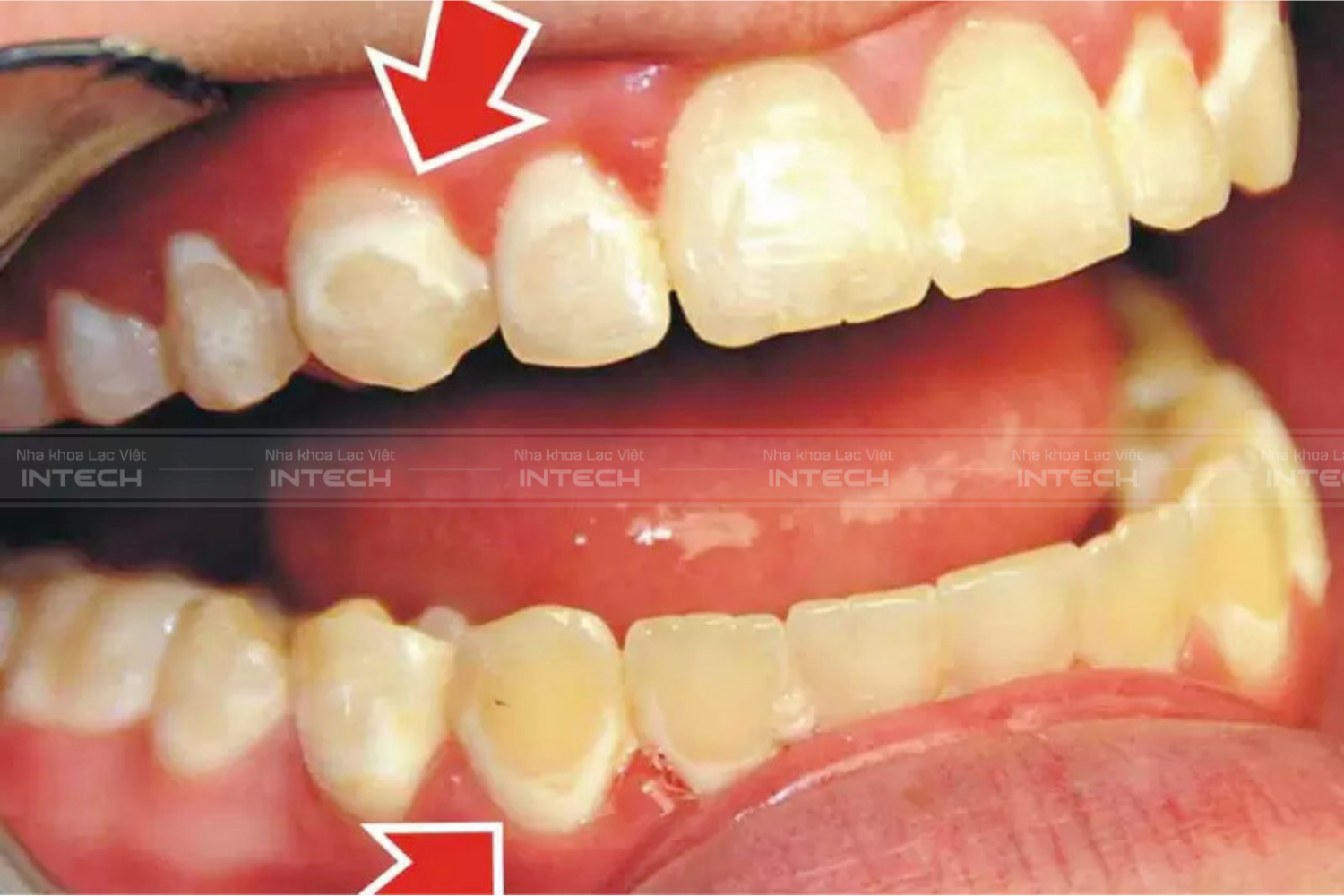 Các bạn có thể nhận thấy biểu hiện của nó khá rõ rệt thông qua hình ảnh này, các đốm trắng liti xuất hiện trên thân răng, nếu người niềng không điều trị kịp thời, rất có thể những vết trắng này sẽ loang dần ra, rất mất thẩm mỹ. Nguy hiểm hơn, nếu huỷ khoáng men răng lâu ngày có thể gây nên hậu quả gãy vỡ, sứt mẻ và nặng nề nhất là rụng răng.
