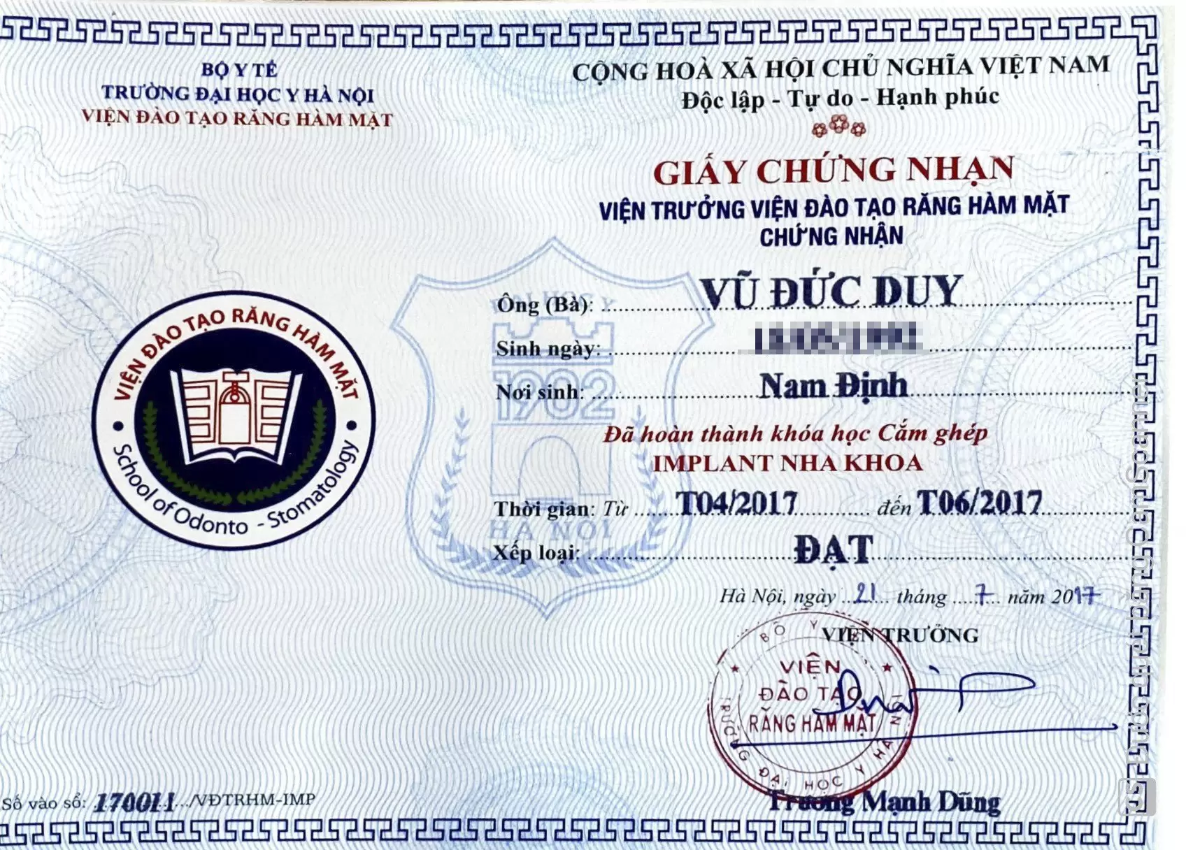 Chứng chỉ cấy ghép Implant của bác sĩ Vũ Đức Duy