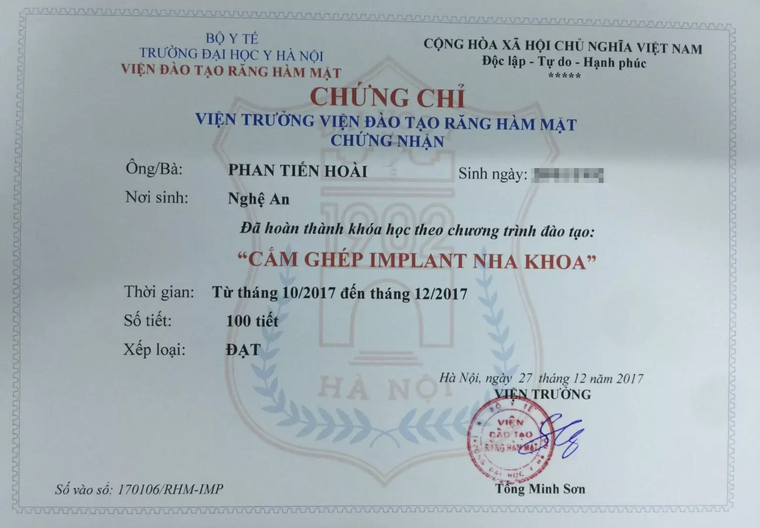 Chứng chỉ cấy ghép Implant của bác sĩ Phan Tiến Hoài