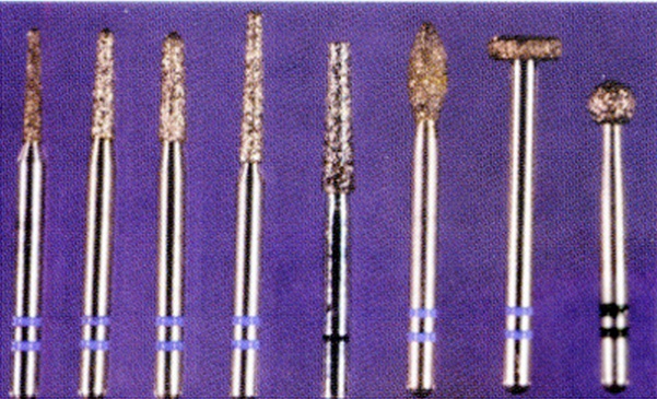 – Mũi trụ kim cương có đầu phẳng và tròn, loại hạt trung bình để mài và loại hạt mịn để đánh bòng hoàn tất
