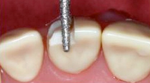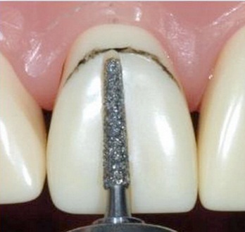 Dùng mũi khoan trụ cắt ngắn rìa cắn 1,8mm so với răng bên cạnh.