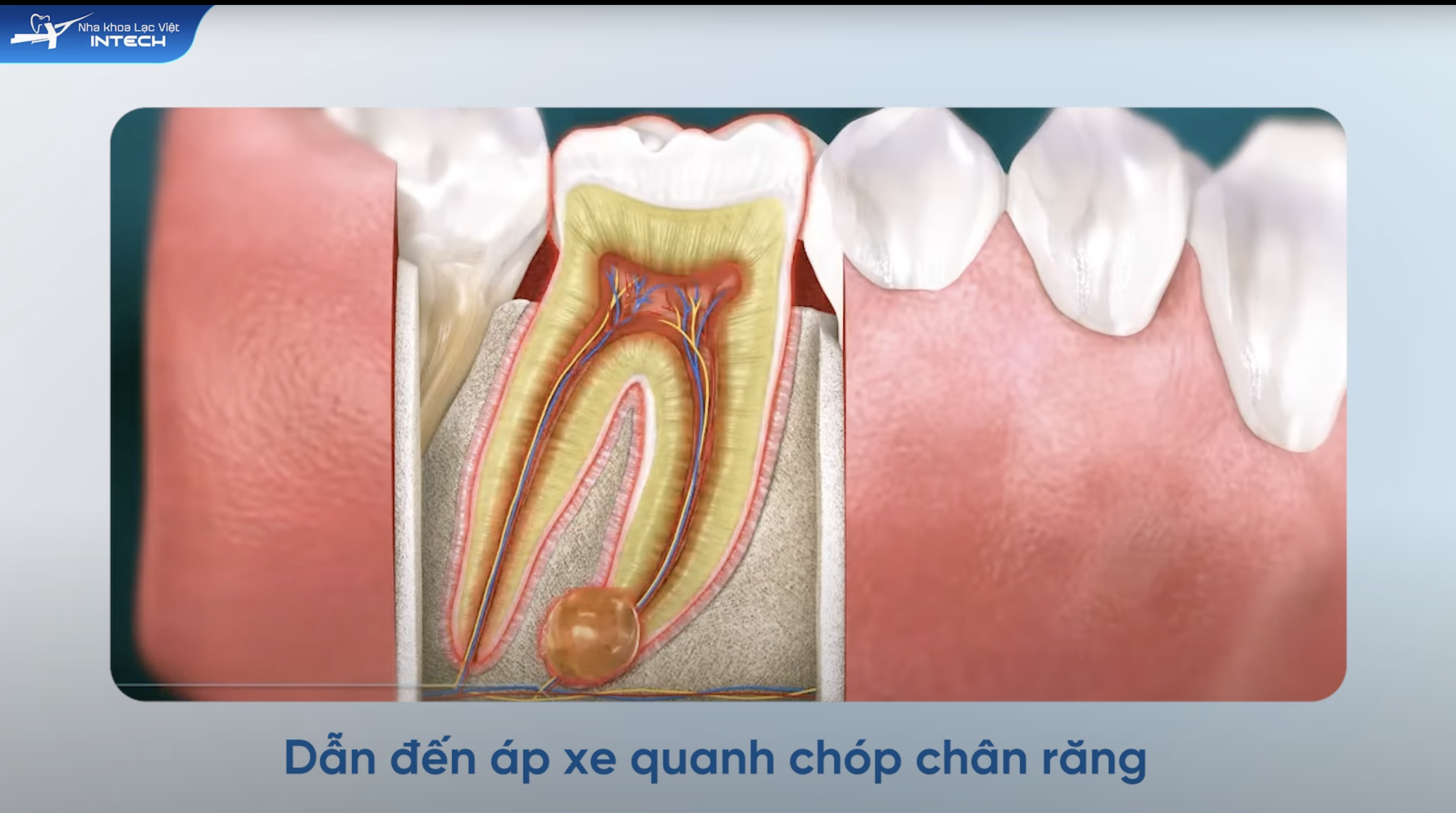 Nguyên nhân phổ biến nhất đến từ những chiếc răng bị sâu lớn nhưng không được điều trị kịp thời. Khi vi khuẩn xâm nhập vào buồng tủy, phần tủy răng bị hoại tử sẽ trở thành nguồn lây nhiễm, tạo điều kiện cho vi khuẩn phát triển mạnh mẽ. Dần dần, chúng lan ra chóp răng, gây viêm quanh chóp và hình thành áp xe. Ổ áp xe này tích tụ dịch mủ, phá hủy xương quanh chân răng, cuối cùng tạo ra lỗ rò để thoát mủ ra ngoài lợi.