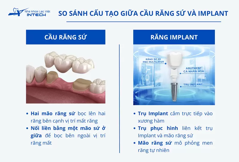 Cầu răng sứ và răng Implant có cấu tạo và mức độ ảnh hưởng các răng bên cạnh khác nhau