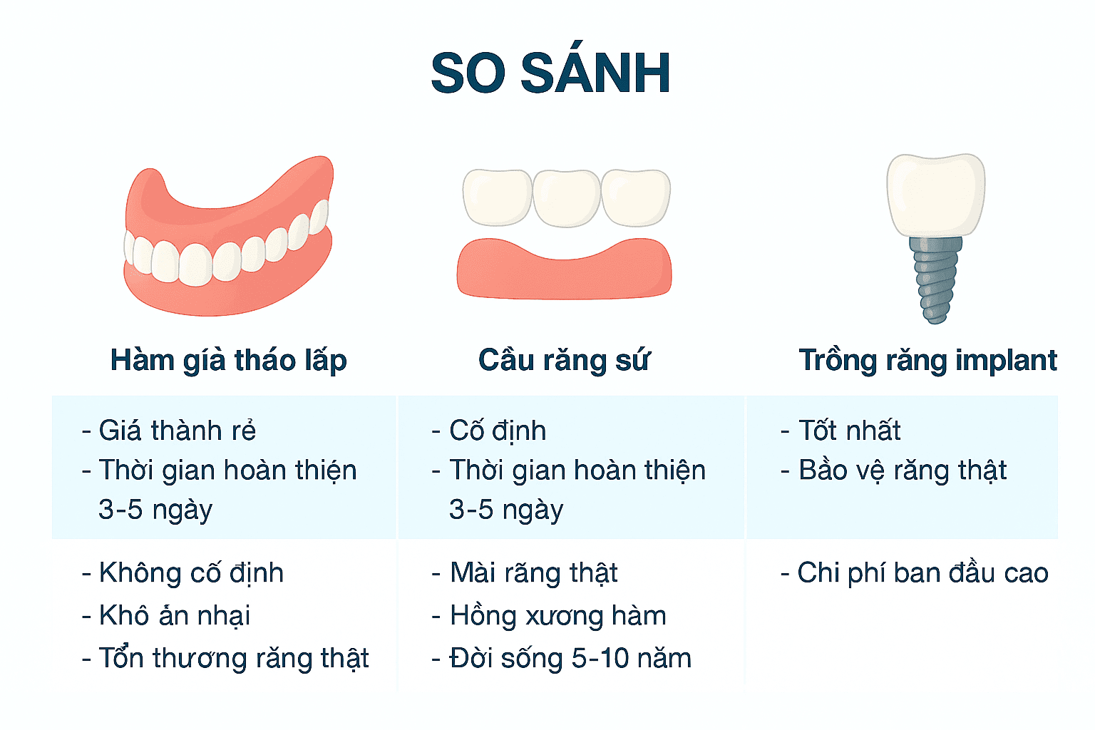 Bảng so sánh ưu và nhược điểm của phương pháp làm cầu răng, hàm giả tháo lắp và trồng implant