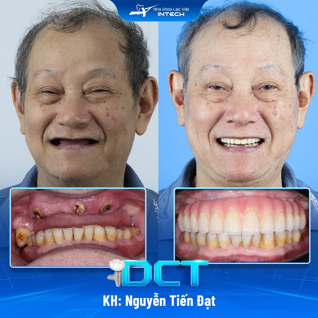 Một minh chứng rõ nhất cô chú anh chị có thể nhìn thấy ở đây. Trước và sau khi trồng răng Implant toàn hàm tại Lạc Việt Intech. Về mặt thẩm mỹ cả trong và ngoài mặt, vị khách hàng này đều rất thay đổi sau trồng răng.