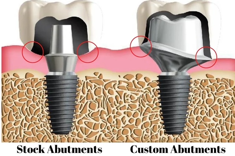 Khác với loại sản xuất sẵn là được sản xuất đại trà từ trước, Customized Abutment được sản xuất sau khi đặt chân implant vào trong xương hàm, nó được tính toán thiết kế và sản xuất để có thể tái lập lại phần lợi quanh implant theo đúng chuẩn giải phẫu của từng răng và từng người.
