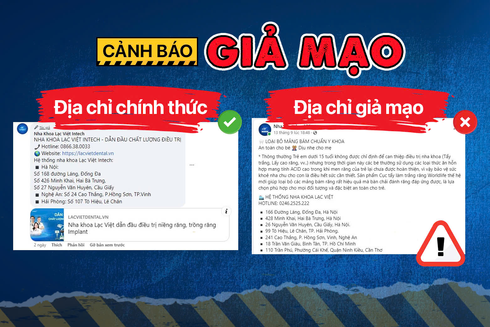 Một lần nữa, chúng tôi xin nhắc lại, để đảm bảo quyền lợi và tránh trở thành nạn nhân của các trang giả mạo, quý khách hàng hãy chỉ tin tưởng và truy cập các kênh thông tin chính thống của Nha Khoa Lạc Việt Intech.