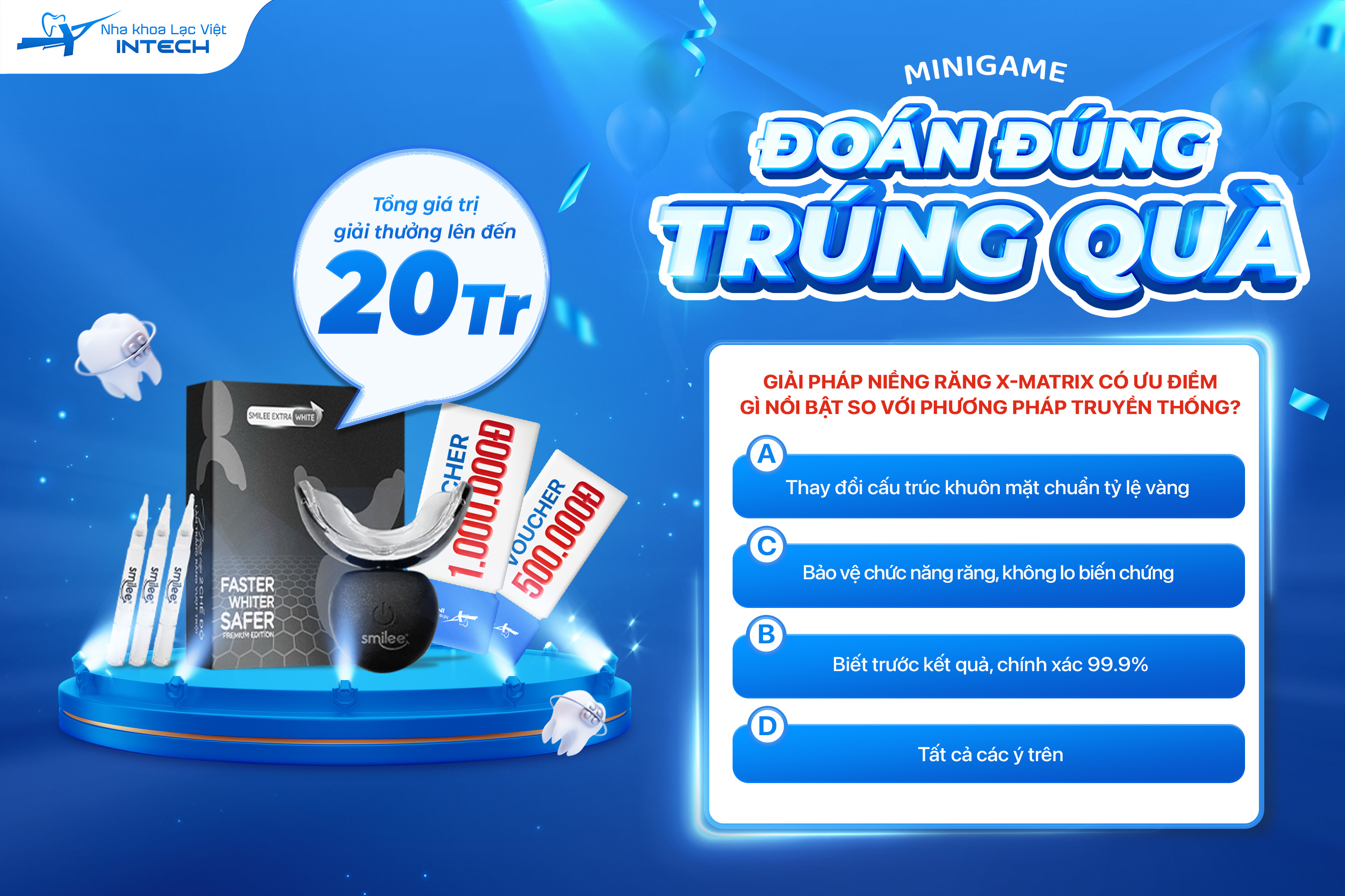 Bộ Kit Làm Trắng Răng Tại Nhà Smilee Extra trị giá 1.300.000 VNĐ dành cho 1 người trả lời sớm và chính xác nhất (hoặc có số thấp hơn gần nhất) với 3 số cuối của giải Đặc Biệt XSMB ngày 24/11/2024.